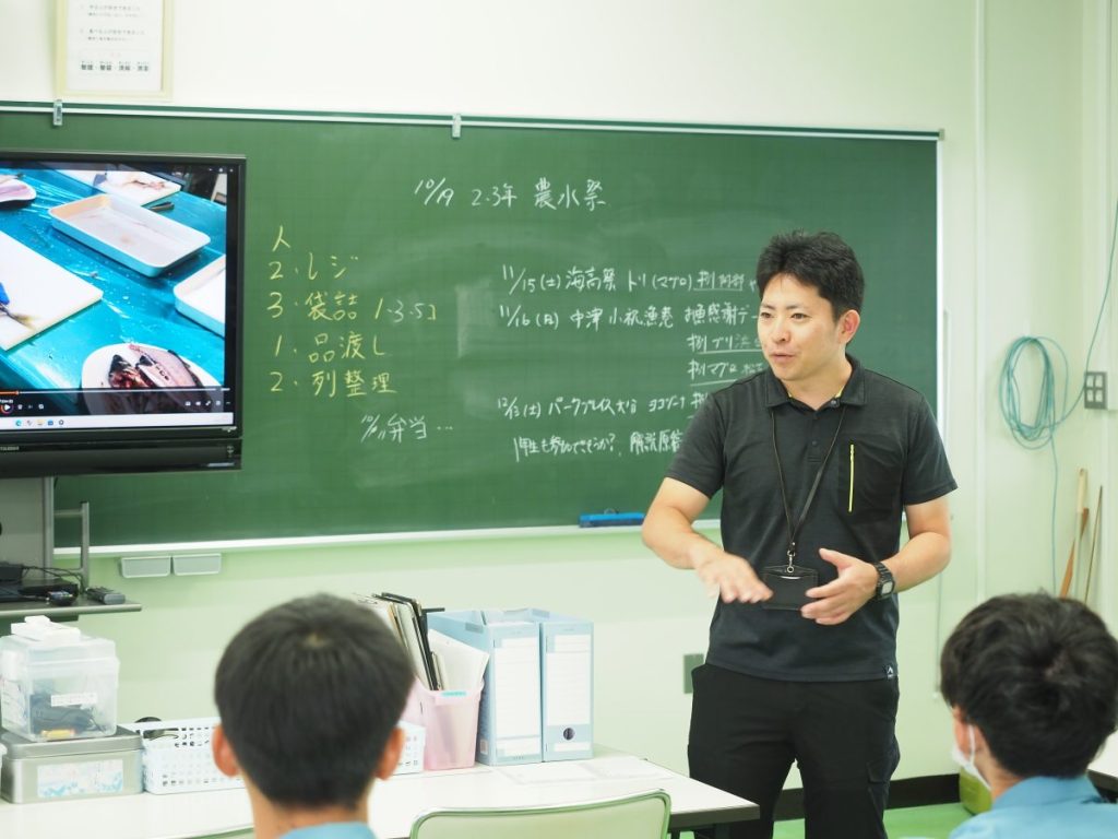 現在は、大分県立海洋科学高等学校の食品コースを担当し、生徒と魚を捌いたり、缶詰を製造しています。河川や干潟、磯での生物採集実習では、生徒よりも楽しんでいる自身があります。最近は食品コースが取り組む藻場再生というテーマで、海藻を食べてしまうブダイをどうおいしく加工するかを生徒と研究しています。