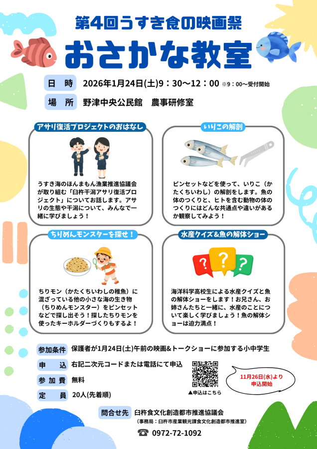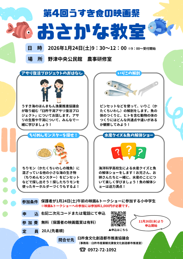 保護者の方が映画鑑賞をしている間、こどもたちは楽しいワークショップに参加することができます。「いりこの解剖」や「ちりめんモンスターを探せ!」、「魚の解体ショー」など盛りだくさん!